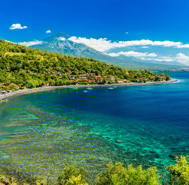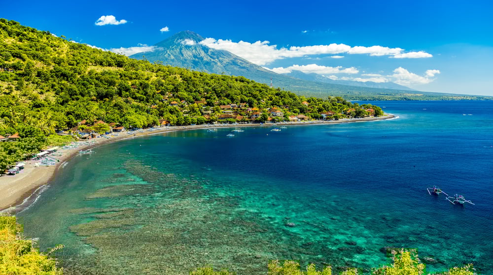 Située à l’est de Bali, Amed offre un paysage très différent du sud de l’île. Les plages sont composées de sable volcanique et les montagnes plongent directement dans la mer.